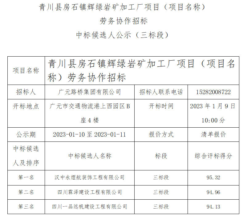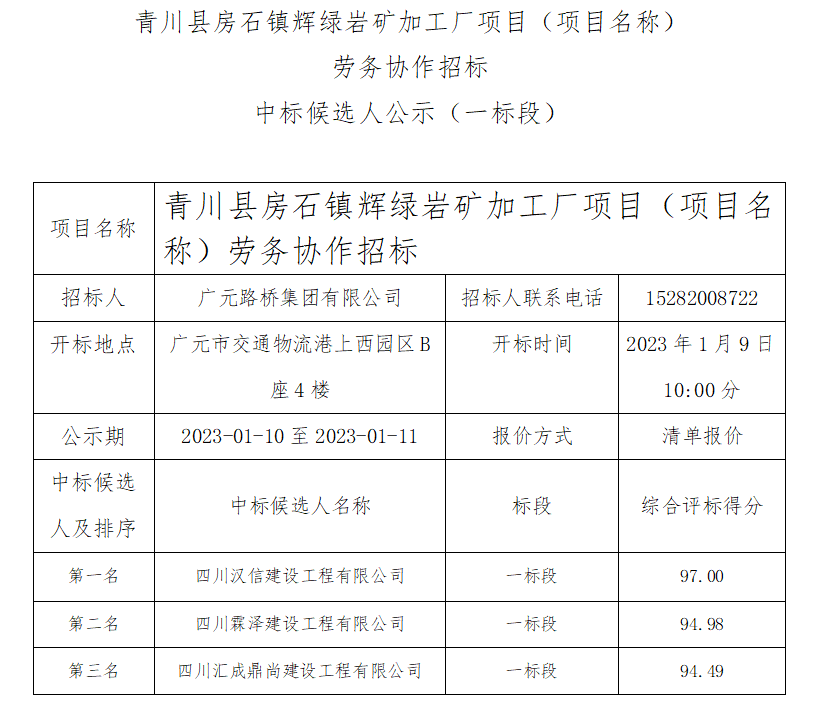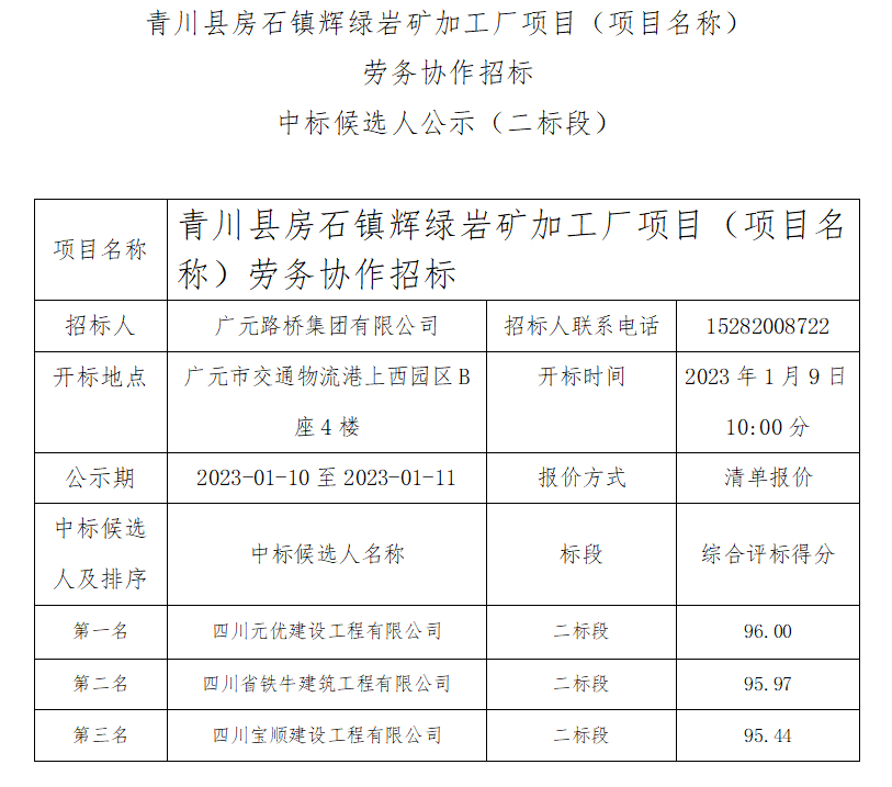 青川縣房石鎮(zhèn)輝綠巖礦加工廠項目(項目名稱) 勞務協(xié)作招標中標候選人公示